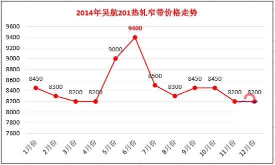 在国内所有生产不锈钢热轧窄带的民营钢厂当中,主要的钢种是201。以吴航201热轧高铜料为例,价格在6月份达到了全年的顶峰,为 9400元/吨。随后出现下滑,后停留在8200元/吨,为2014年画上了句号。其中,2014年吴航201热轧窄带价格走势如下图所示: