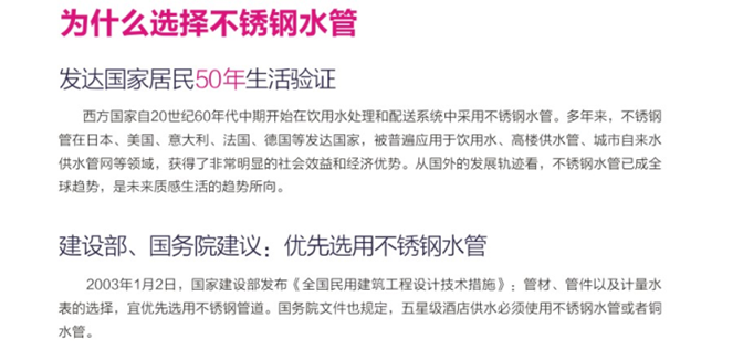 选用优质不锈钢材料做给水管,在世界上已成为一种趋势。资料表明,在德国,80%以上的居民选用不锈钢材料的水管;在日本,东京已有85%以上的住户采用不锈钢材料的水管;在澳洲,已经开始更换其他管材,改用不锈钢材料的水管;在美国,拉斯维加斯五星级宾馆的水管全部采用不锈钢材料。