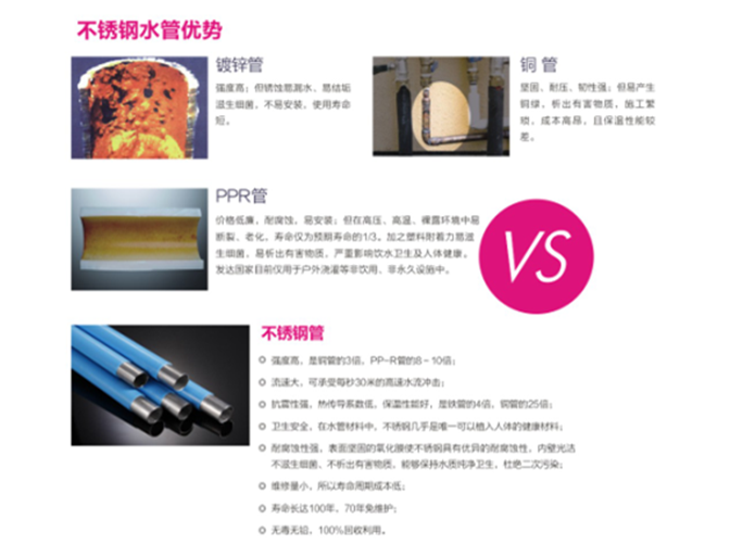 4.卫生安全,在水管材质中,不锈钢是公认可以植入人体的健康材料;