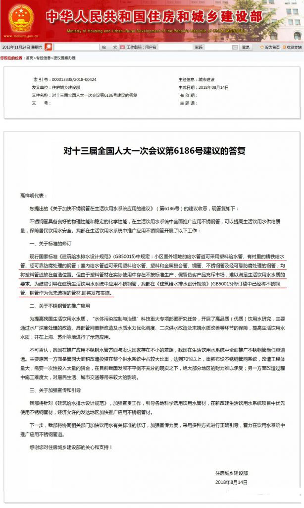近年来,中央和地方加大了饮用水安全保障工作的力度,采取了一系列工程和管理措施。随着人们生活水平的提高,家庭生活用水品质的提升首当其冲,而更耐用,更健康,更安全的家庭水管的出现就显得尤为迫切。近日,国家住房城乡建设部在《对十三届全国人大一次会议第6186号建议的答复》中公开表态:为鼓励引导在建筑生活饮用水系统中应用不锈钢管,我部在《建筑给水排水设计规范》(GB50015)修订稿中已经将不锈钢管、铜管作为优先选择的管材,即将发布实施。我部将针对《建筑给水排水设计规范》,加强宣贯工作,引导各地科学选用饮用水管材,在新改建生活饮用水系统项目中优先使用不锈钢管材,经济允许的发达地区加快推广应用不锈钢管材。下一步,我部将协同相关部门加快饮用水有关标准的修订,加强宣传力度,采用多种方式进行正确引导,着力在饮用水系统中推广应用不锈钢管道。