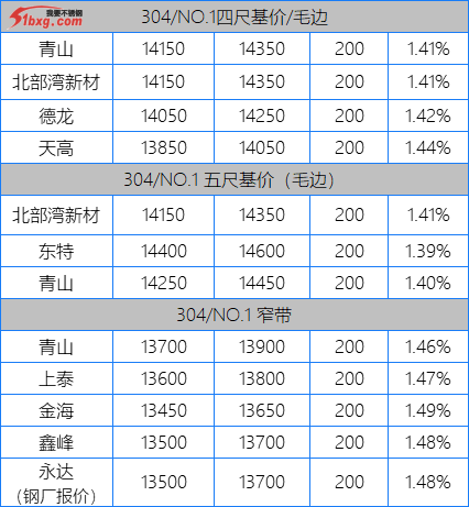 从报价来看,市场多次调涨报价后,整体累计涨200-300元/吨。从成交来看,304不锈钢水管市场贸易商反馈出货尚可,如大板的一些较好规格于早上已被“抢走”,个别产地现货有缺,但市场贸易商反馈称,北部湾新材资源在下周有到货,今日订货能优价。看来,市场还是要在涨价的时候才有买卖的动力。另外,青山钢厂虽然未对304热轧启动新盘价,但是有消息称,钢厂允许代理以成本价14300元/吨补点大板现货!