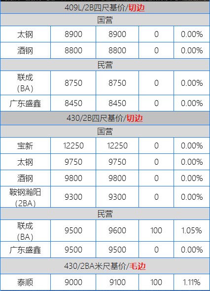 早间,市场报价部分持平,部分继续有涨100元/吨,目前主流报价:太钢9700-9800元/吨、酒钢在9750-9850元/吨、联众430/2BA在9200-9500元/吨。